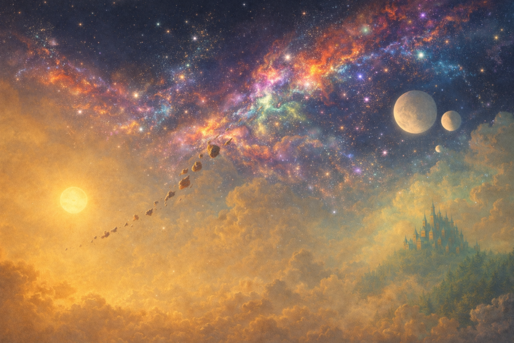 Par instants, la brume se creusait sous ses pas, révélant les profondeurs du ciel où descendaient de lourdes chaînes, comme si l’île était arrimée au cœur du monde. »