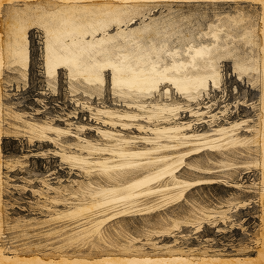 Les dunes y changent de place au gré de tourbillons visibles, et l’on y découvre parfois les fragments brisés des Ærolithes, abandonnés comme des carcasses offertes au vent.